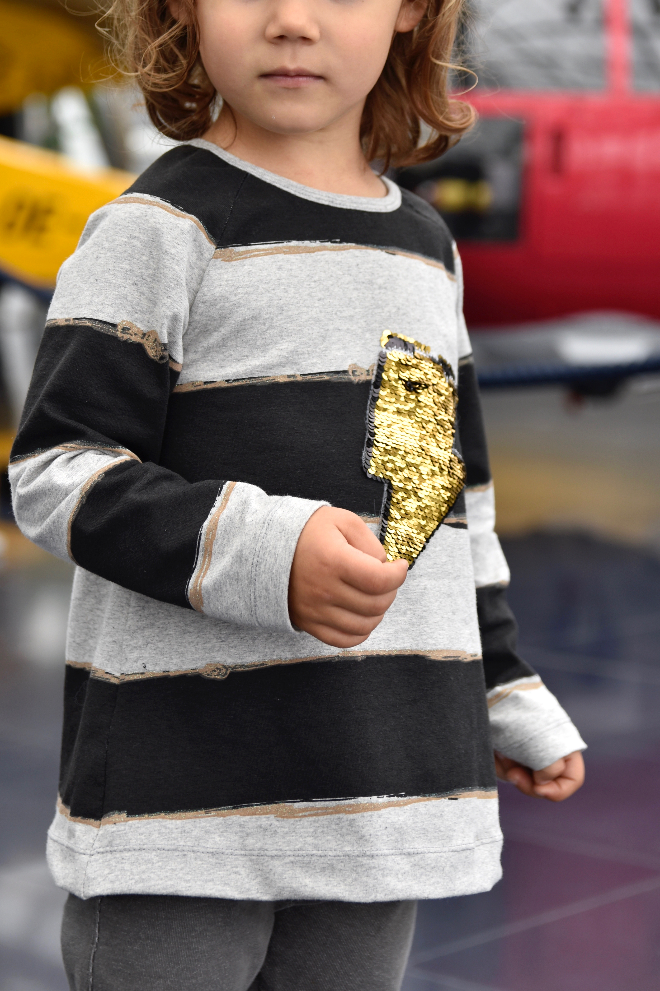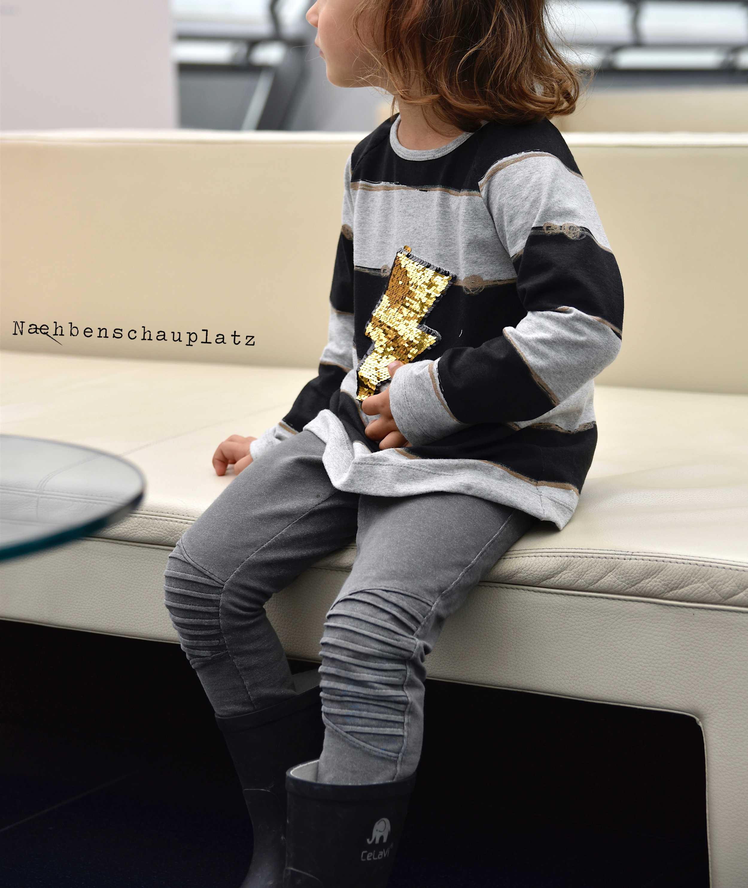„Mama, nähst du mir ein Wisch-Shirt?“, fragte mich die kleine Madame letzte Woche. Gemeint waren damit Wendepailletten und ich hatte in weiser Voraussicht vor einiger Zeit zwei Patches bei Alles-fuer-Selbermacher bestellt. Die Wahl fiel auf „Flash“ und dazu war auch schnell der passende Stoff aus dem Vorrat gezogen: Den Jersey „For You – Stripes“ von Lillestoff hatte ich zwar eigentlich für mich gekauft, aber was tut man nicht alles für das Prädikat „Beste Mama“.