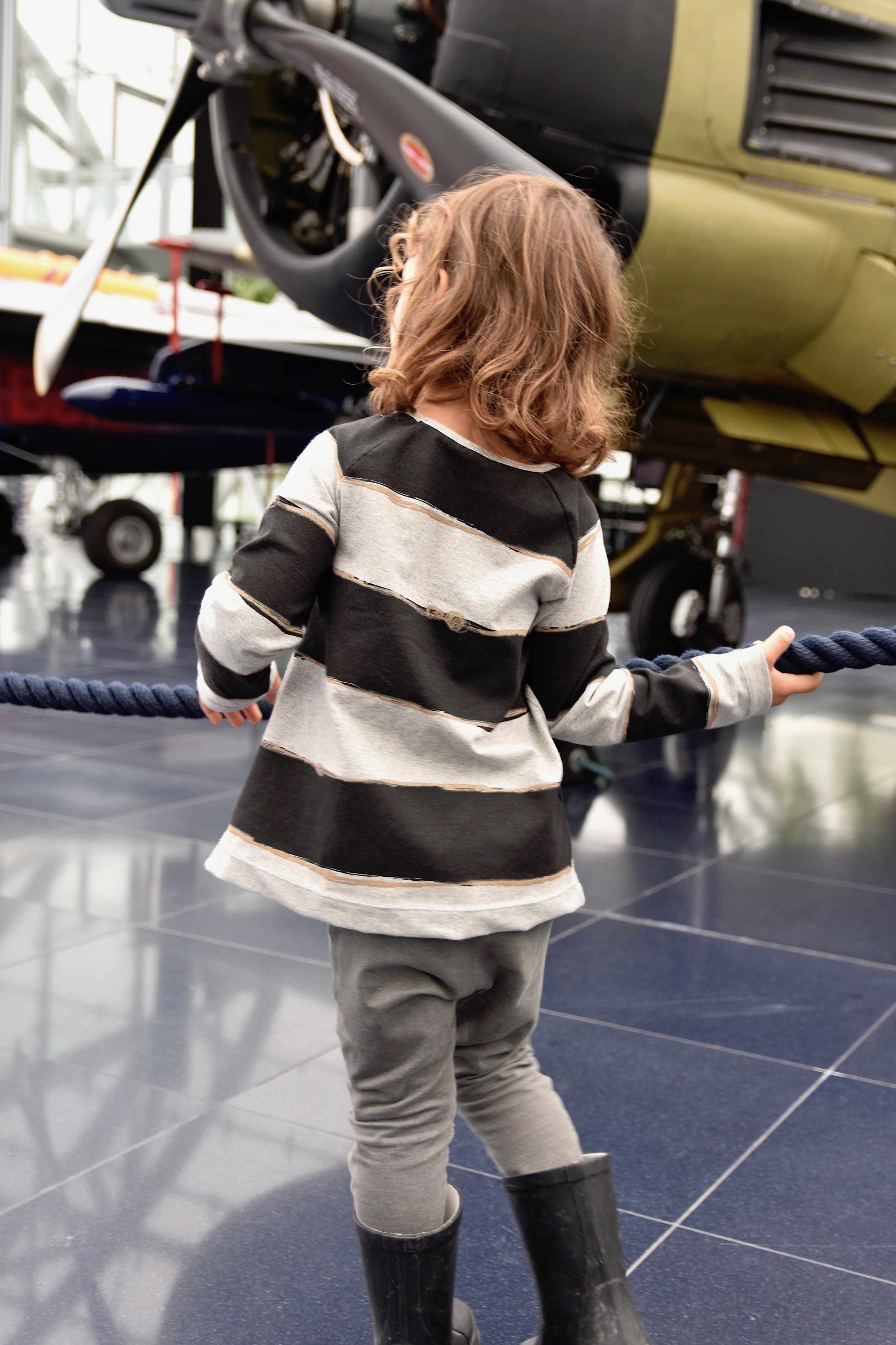 Für den nun doch plötzlich eingetretenen Herbst sollte es ein Langarm-Shirt werden, die Wahl fiel auf das Raglan-Kleid von Klimperklein, als Shirt gekürzt und eine Spur weniger ausgestellt. Der Schnitt an sich ist ja recht einfach, ich habe mich dafür bemüht, sehr ordentlich zu nähen: Die Streifen treffen sich, so gut das mit den etwas unregelmäßigen Ringeln möglich war. Der Halsausschnitt ist mit einer Streifenversäuberung (pun intended) versehen und mit der Zwillingsnadel abgesteppt, ebenso die Säume.