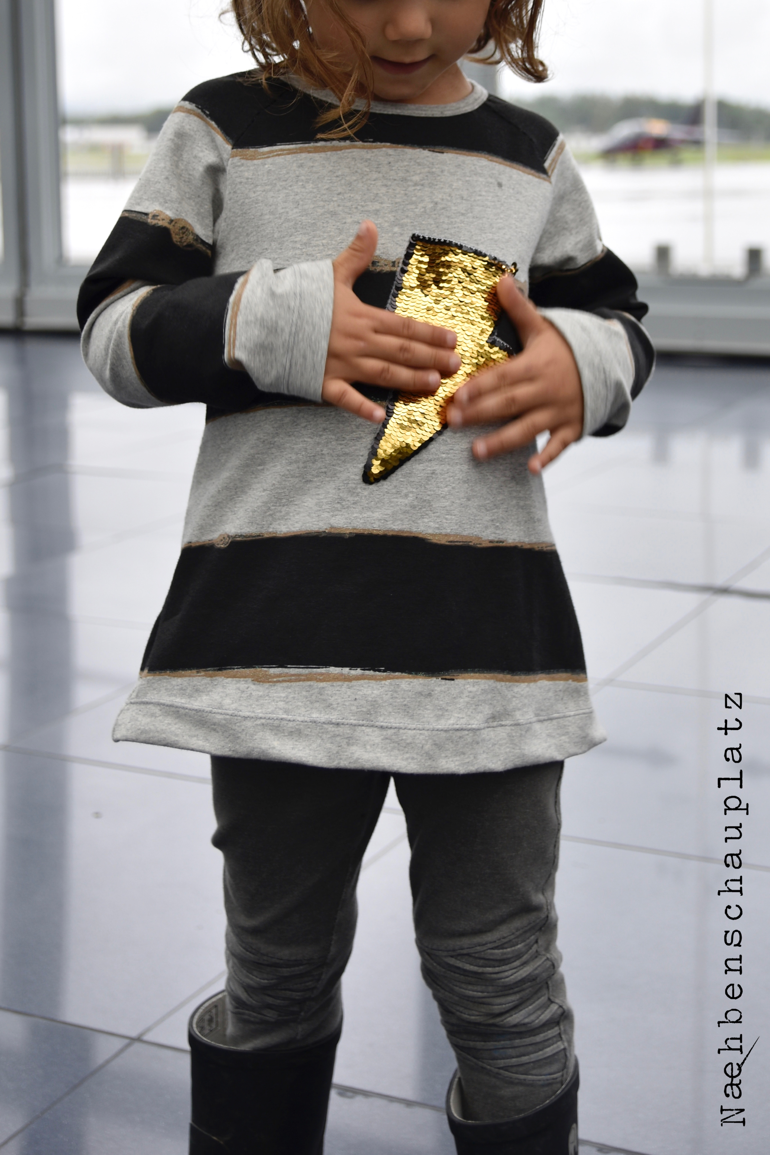 Genäht habe ich Größe 104 für das 1m große Kind – war zwar nicht so geplant, aber da hat sie noch etwas Platz zum hineinwachsen … Den Patch hatte ich ursprünglich nur auf die Schnelle einmal rundherum angenäht und dann das Trägermaterial (zu) knapp abgeschnitten. Nachdem der Patch dann zwei Tage lang permanent rauf und runter gewischt wurde, musste ich da bereits nachnähen und habe jetzt quer durch die Pailletten Nähte gesetzt. Merke fürs nächste Mal: ganzen Patch mit Vlisofix aufbügeln und dann erst annähen …